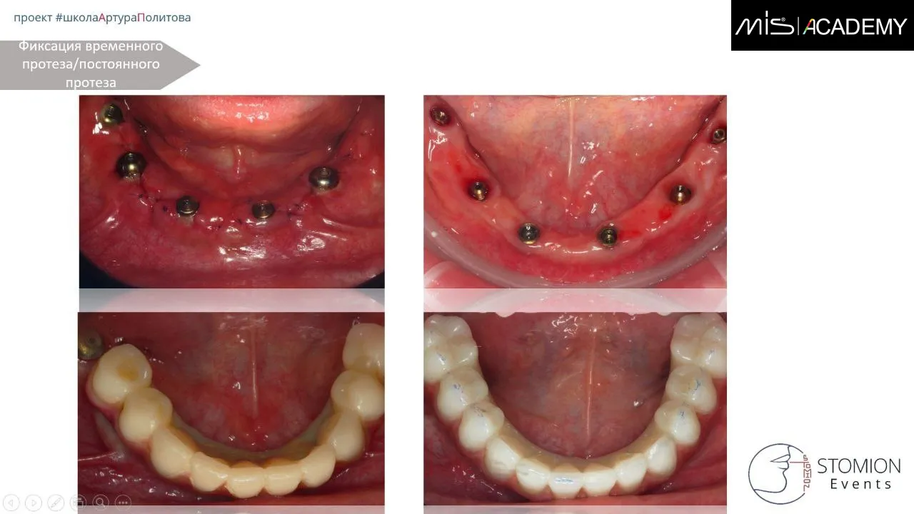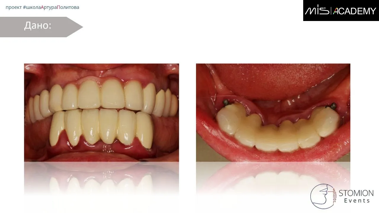 — Далее с 6-го месяца изготовление постоянной конструкции FP-3, диоксид циркония с нанесением, с фрезерованным, анодированным титановым каркасом с уровня мультиюнитов и коннектов.