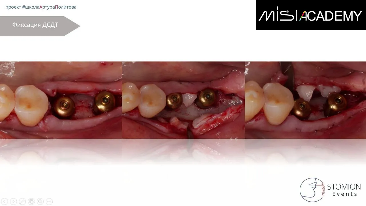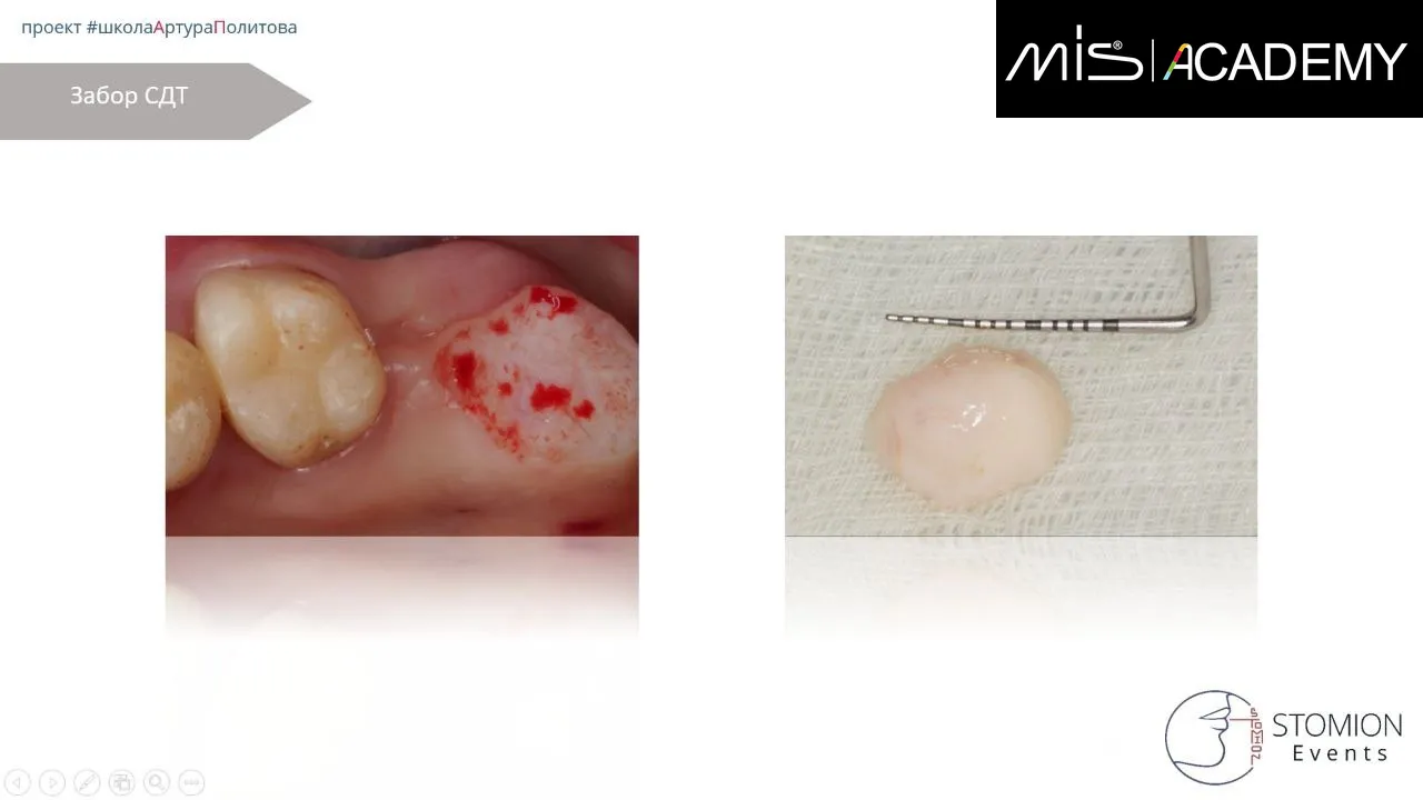 — Фенотип десны не плохой, но был нарушен периметр, ввиду хорошего бугра, выполнена дубликатура лоскутов язычно и вестибулярно. Трансплантат с бугра забирался СДТ одним горизонтальным разрезом, далее деэпителизация.