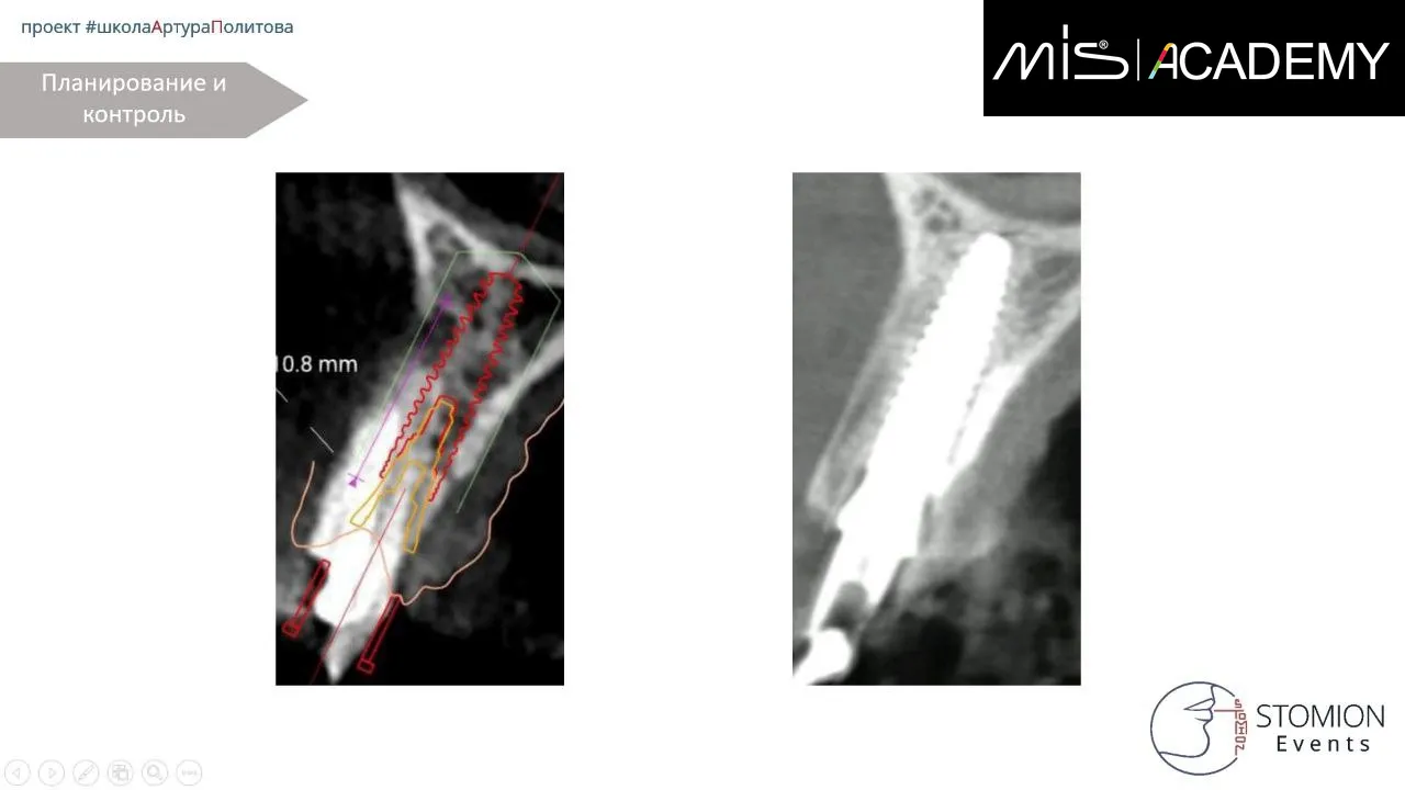 — По НХШ установлен имплантат MIS C1 3,3х13 (для получения торка), забор аутокости с бугра ВЧ, IDR, СТТ вестибулярно, коннект 3мм, немедленная нагрузка временной коронкой, изготовленной до операции, фиксация через позиционер.