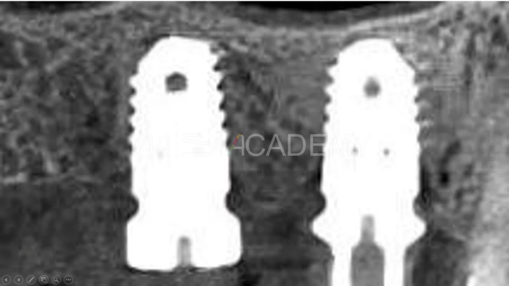• КЛКТ: выраженная резорбция костной ткани вокруг имплантата.