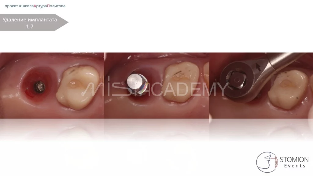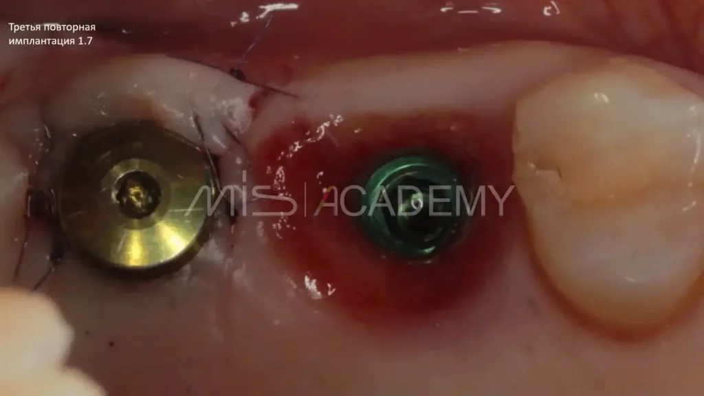Однако через 3 месяца выявлено отсутствие остеоинтеграции имплантата в позиции 1.7. Проведено удаление и повторная установка по тому же шаблону.