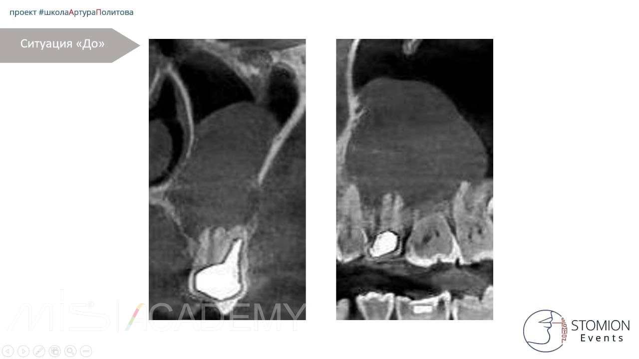 — Провели КЛКТ и анализ полученных данных. Обнаружена корневая киста примерно 26х28мм от зуба 2.5.
