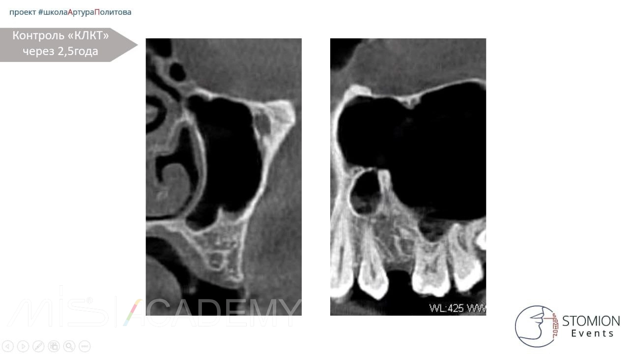 Далее пациентка пропала с радаров. Через 2,5 года на КЛКТ мы видим полное восстановление костной ткани, восстановление синуса. Это очередная победа декомпрессии над привычными методами.