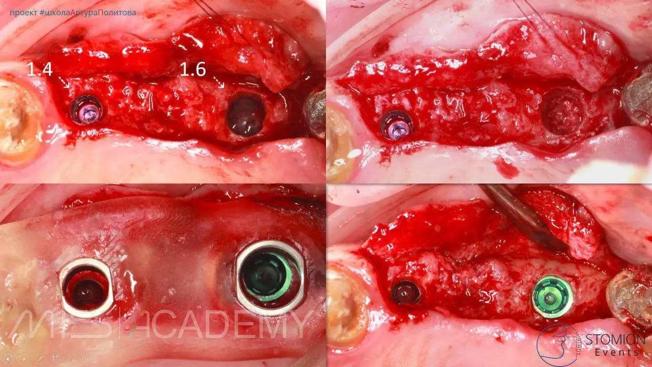 — В зазоры лунок уложен Bio-Oss S, сверху A-PRF мембраны в два слоя.
