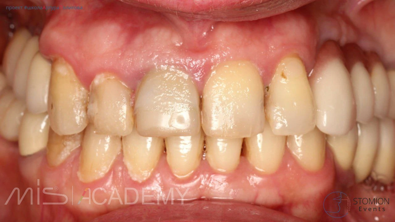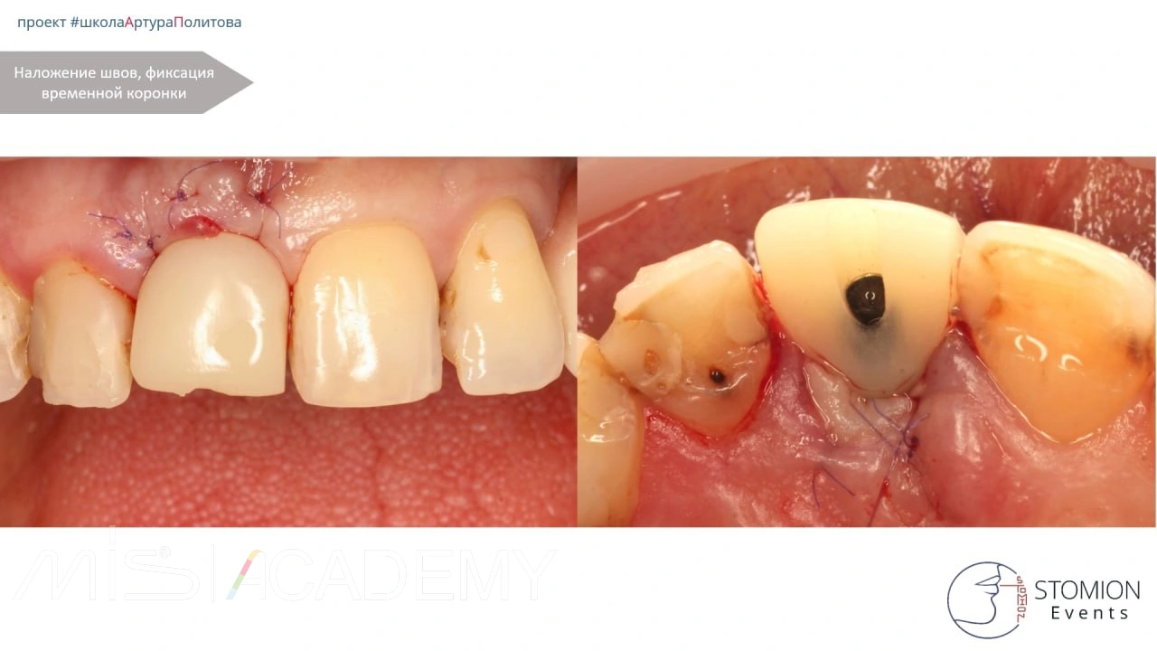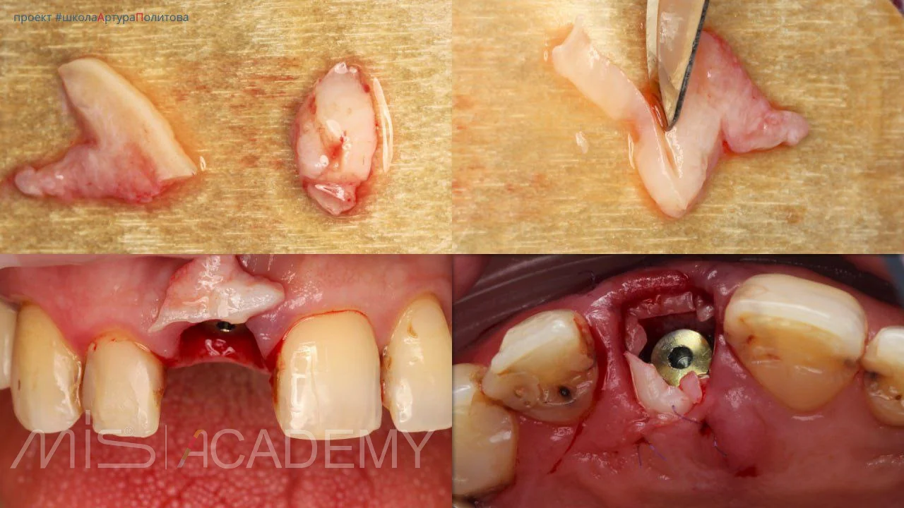 — С нёбной стороны использован трансплантат с сохранённой эпителиальной полоской для компенсации дефицита мягких тканей.