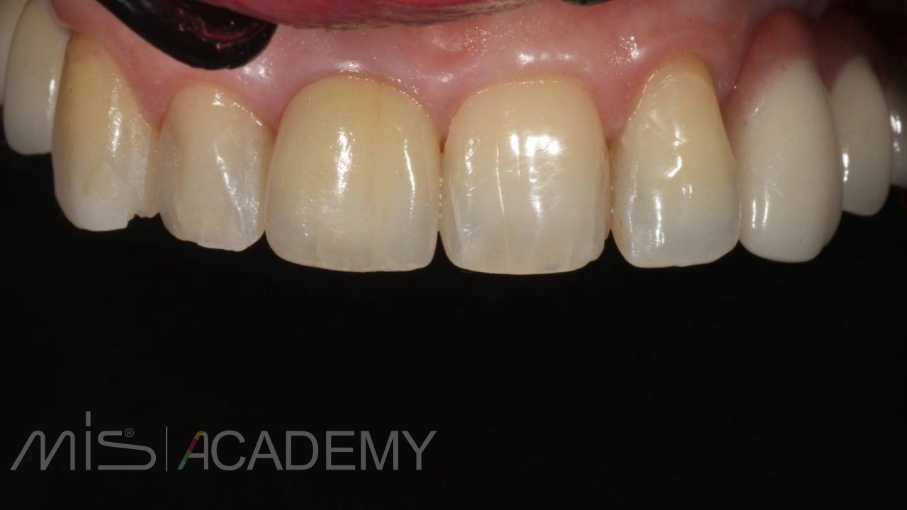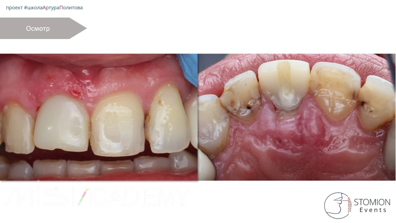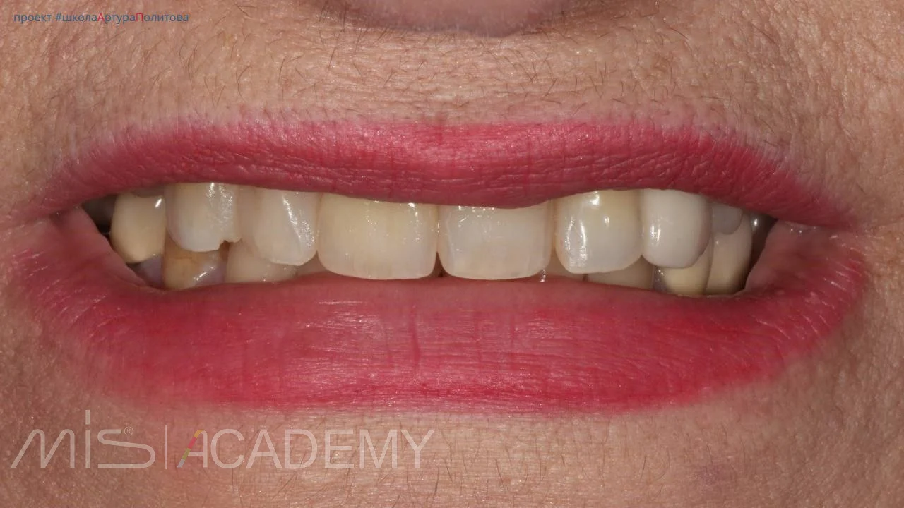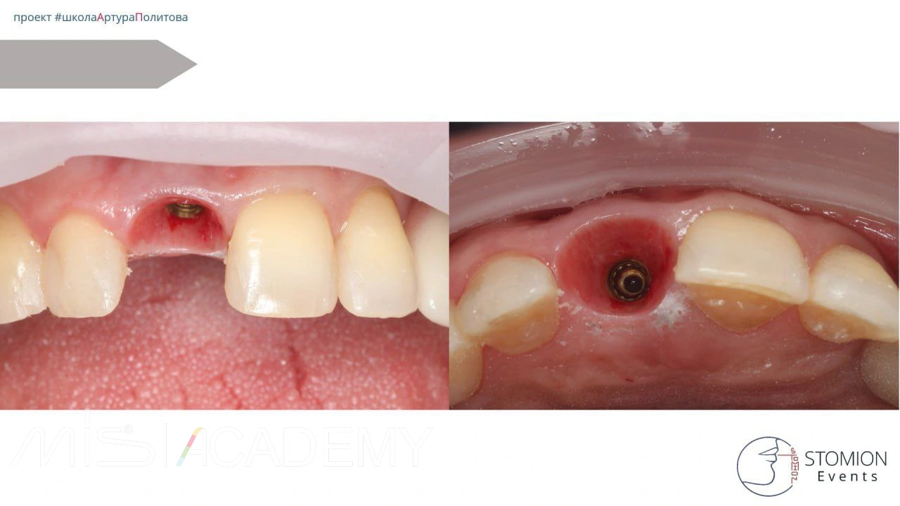 — С нёбной стороны использован трансплантат с сохранённой эпителиальной полоской для компенсации дефицита мягких тканей.