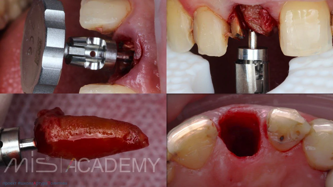 Атравматичное удаление зуба 1.1 с использованием системы Benex. Тип лунки — I (интактная).