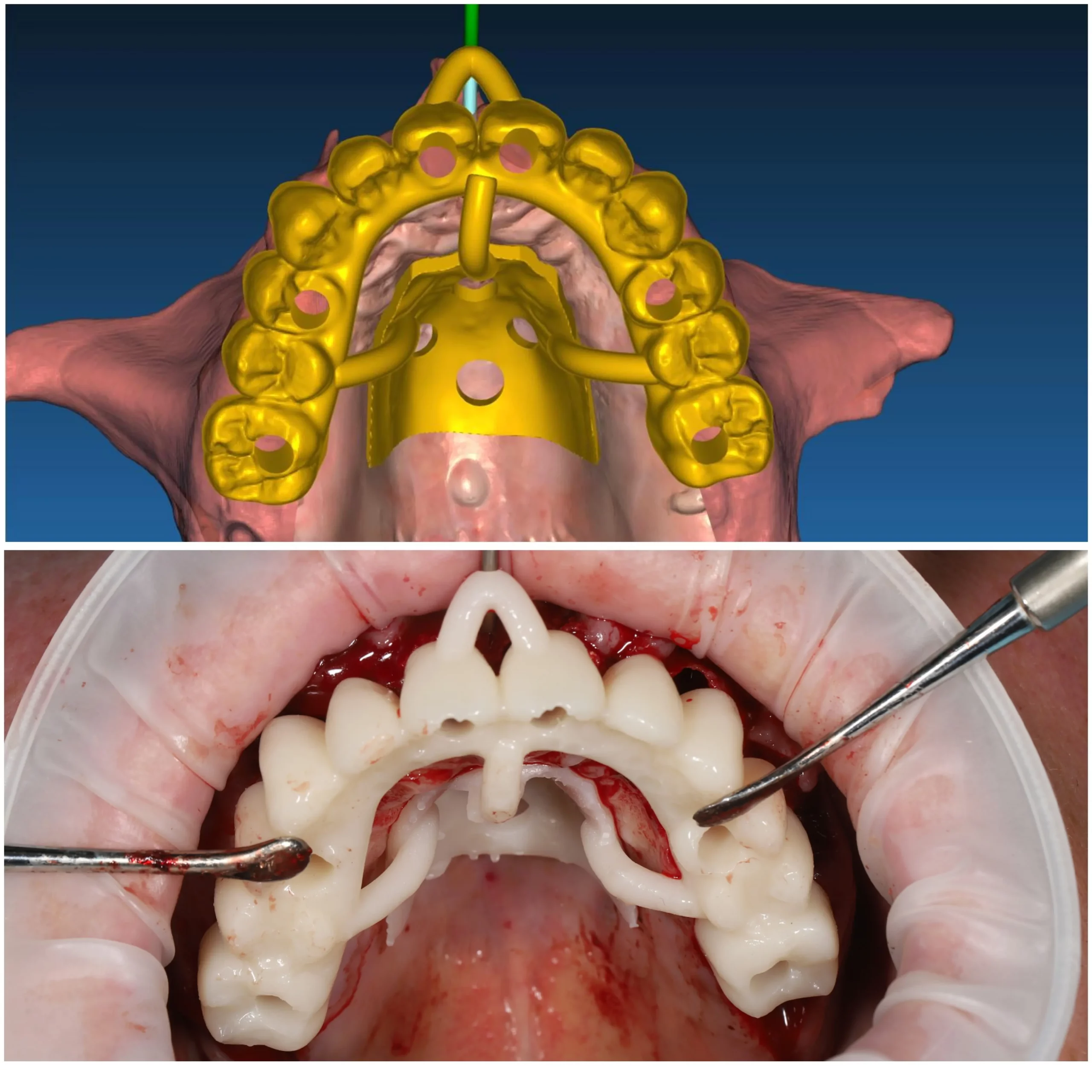 4. Примерка протеза для нагрузки (заживляющая балка). Протез фиксируется на небную лапку и пин с вестибулярной стороны.