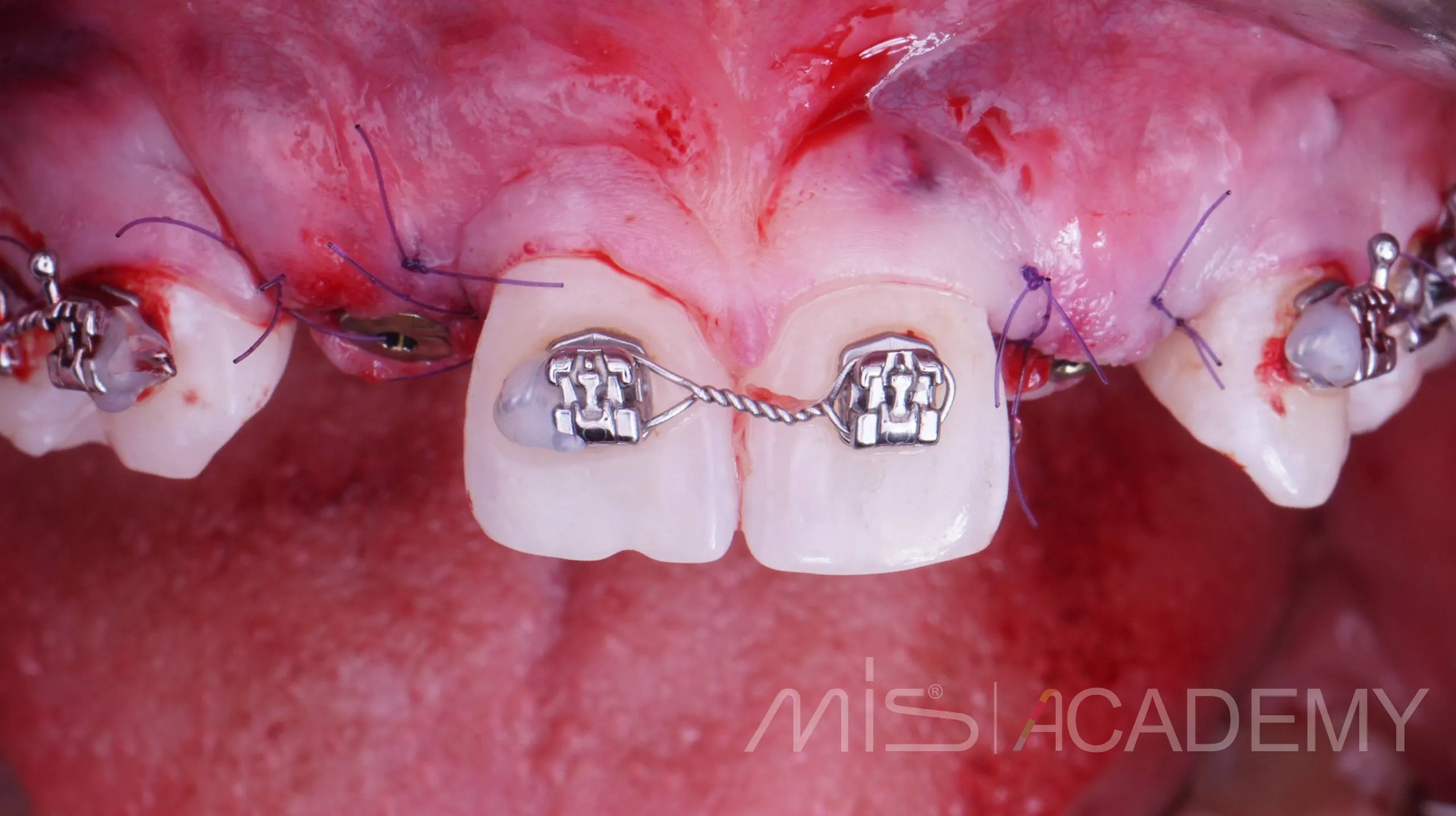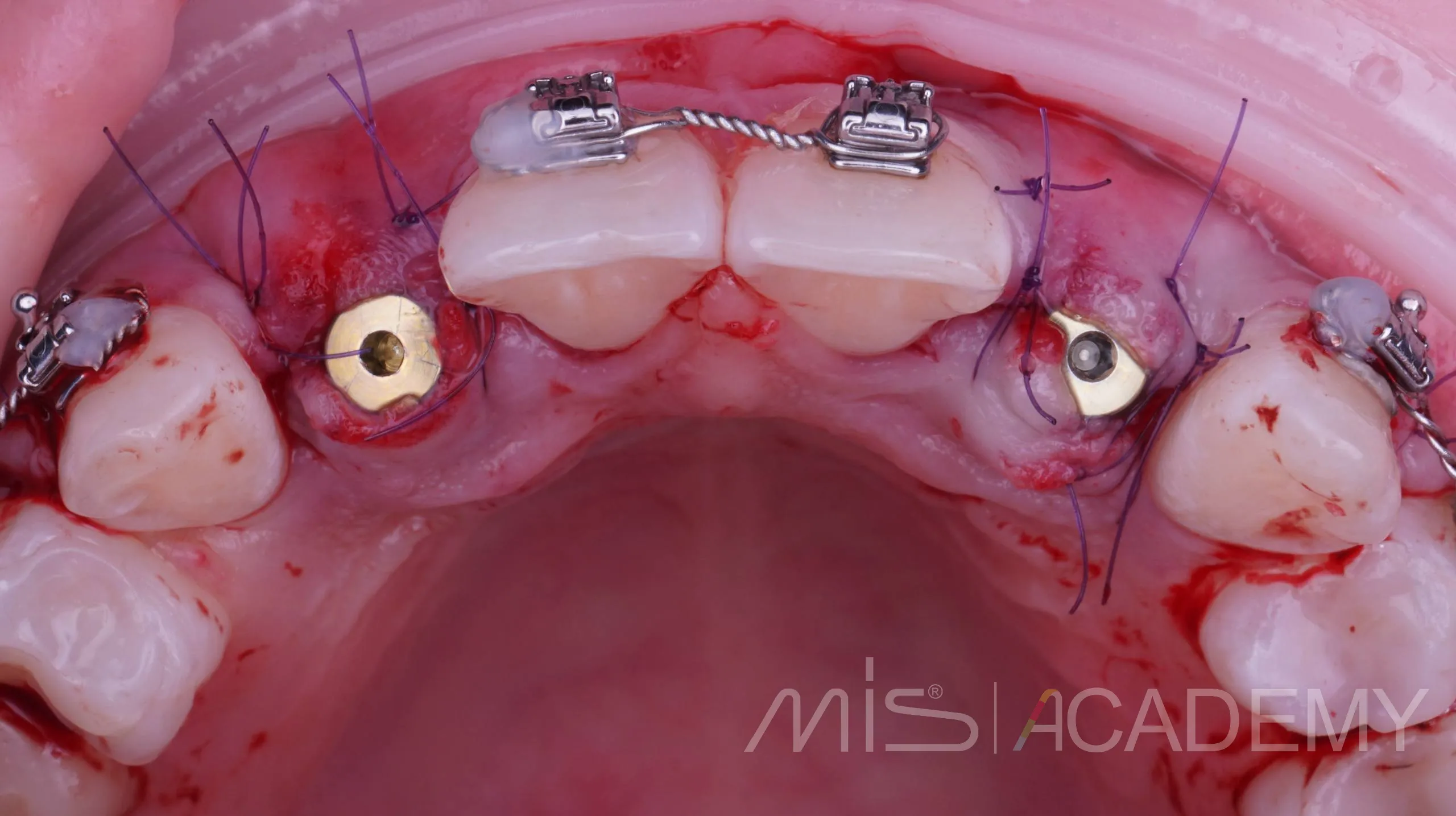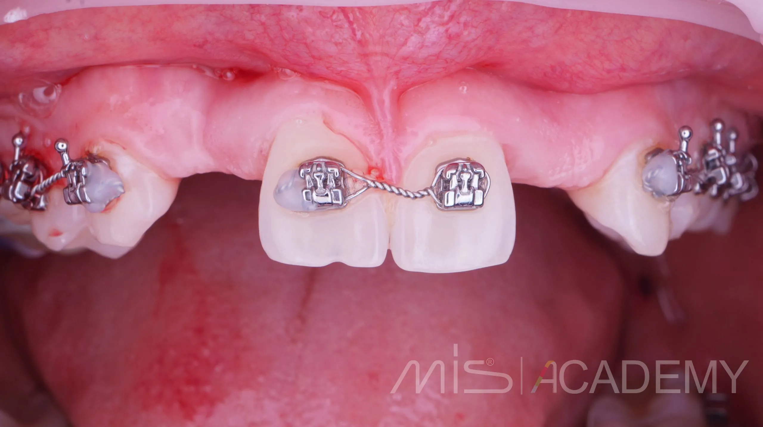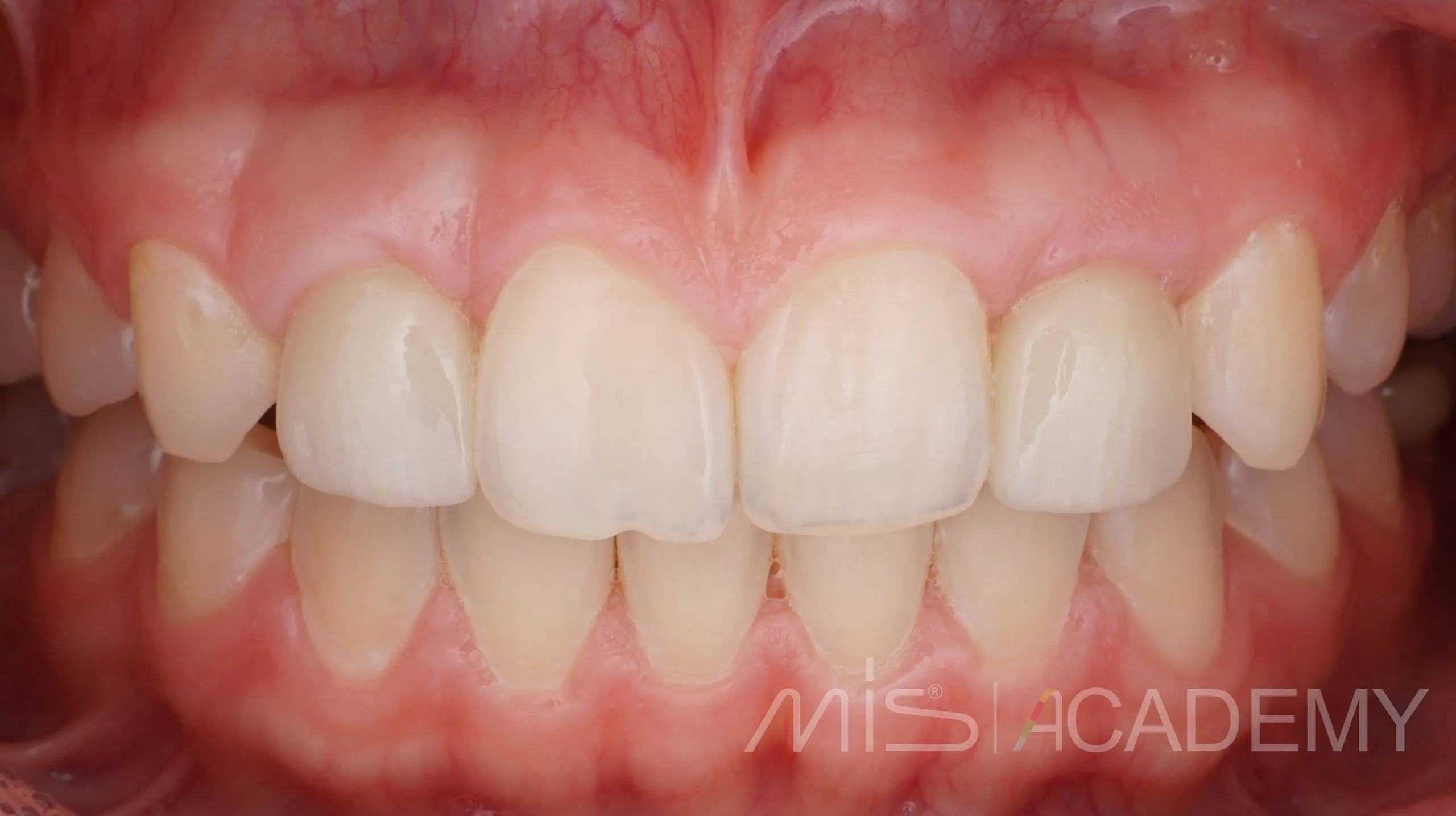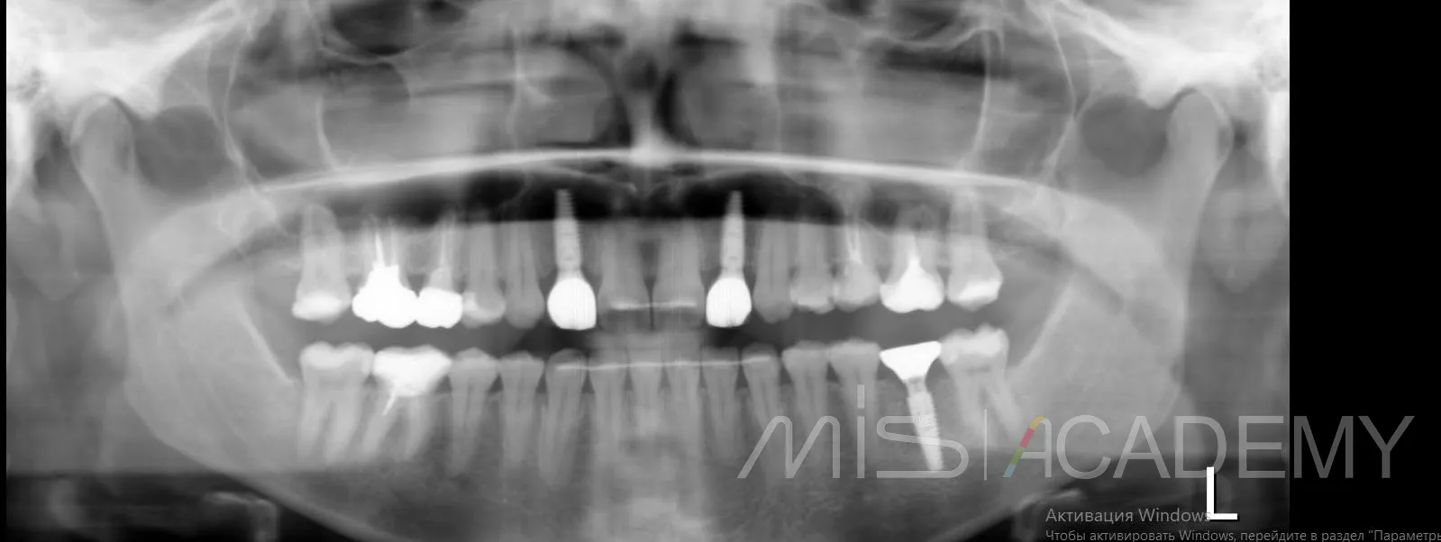 Небольшой рекол в 1 год после имплантации в область адентии двоек на верхней челюсти.
