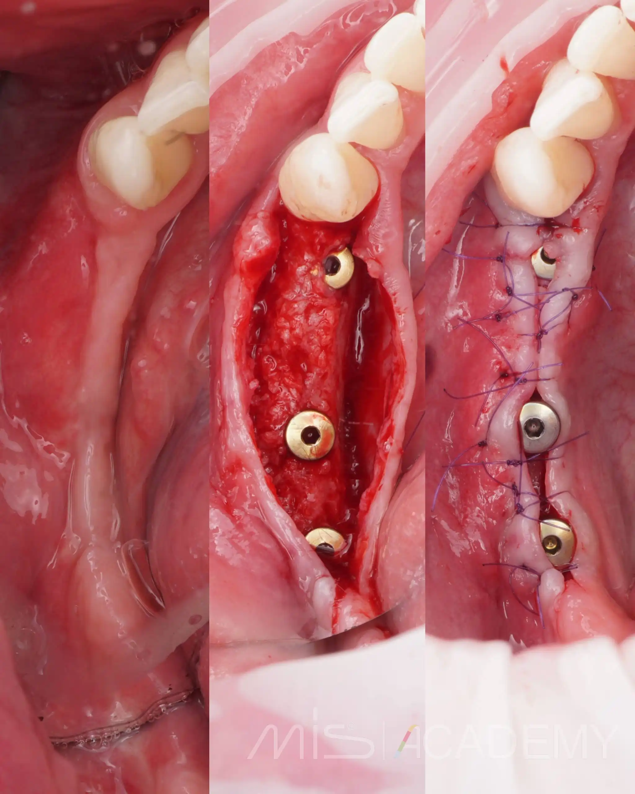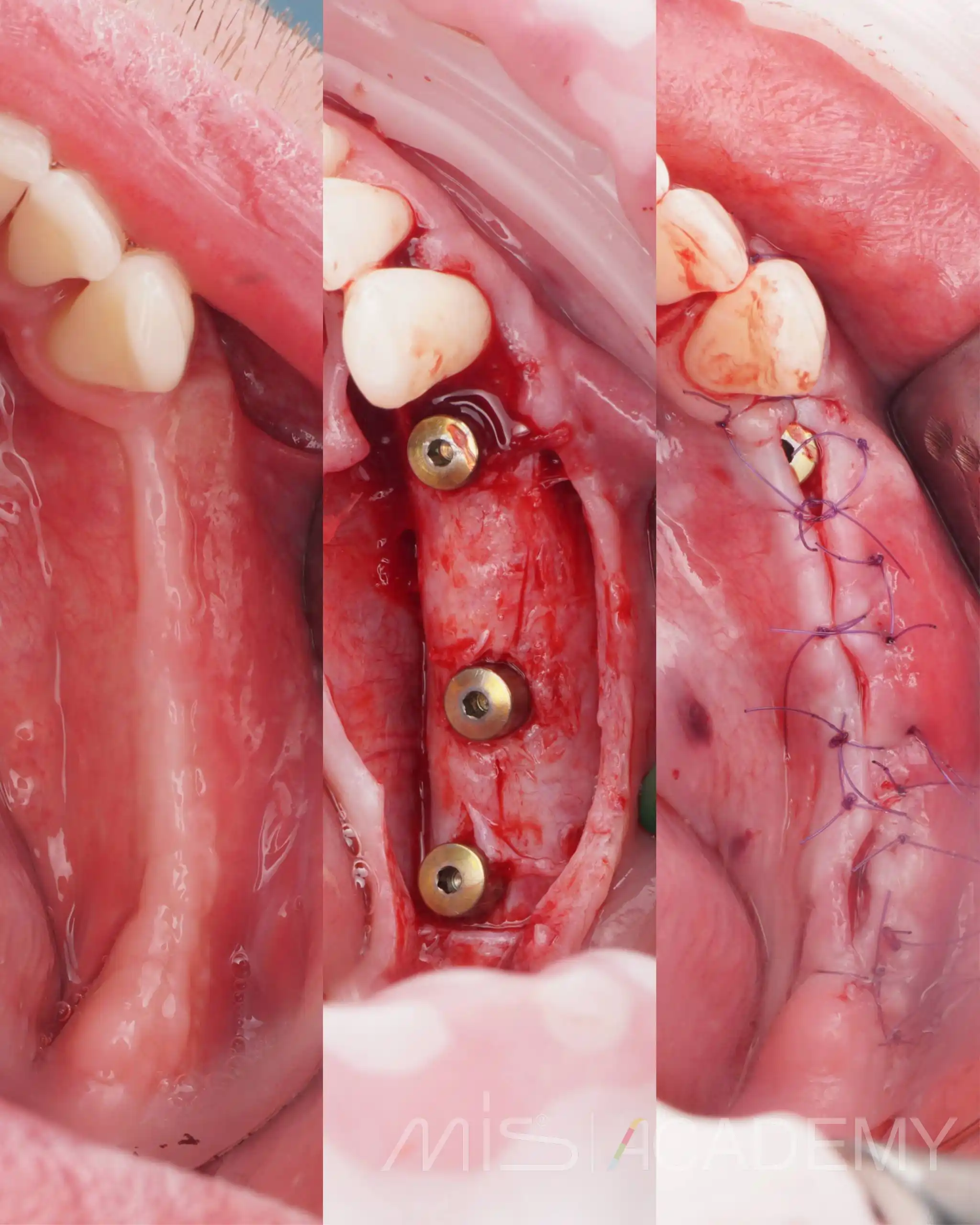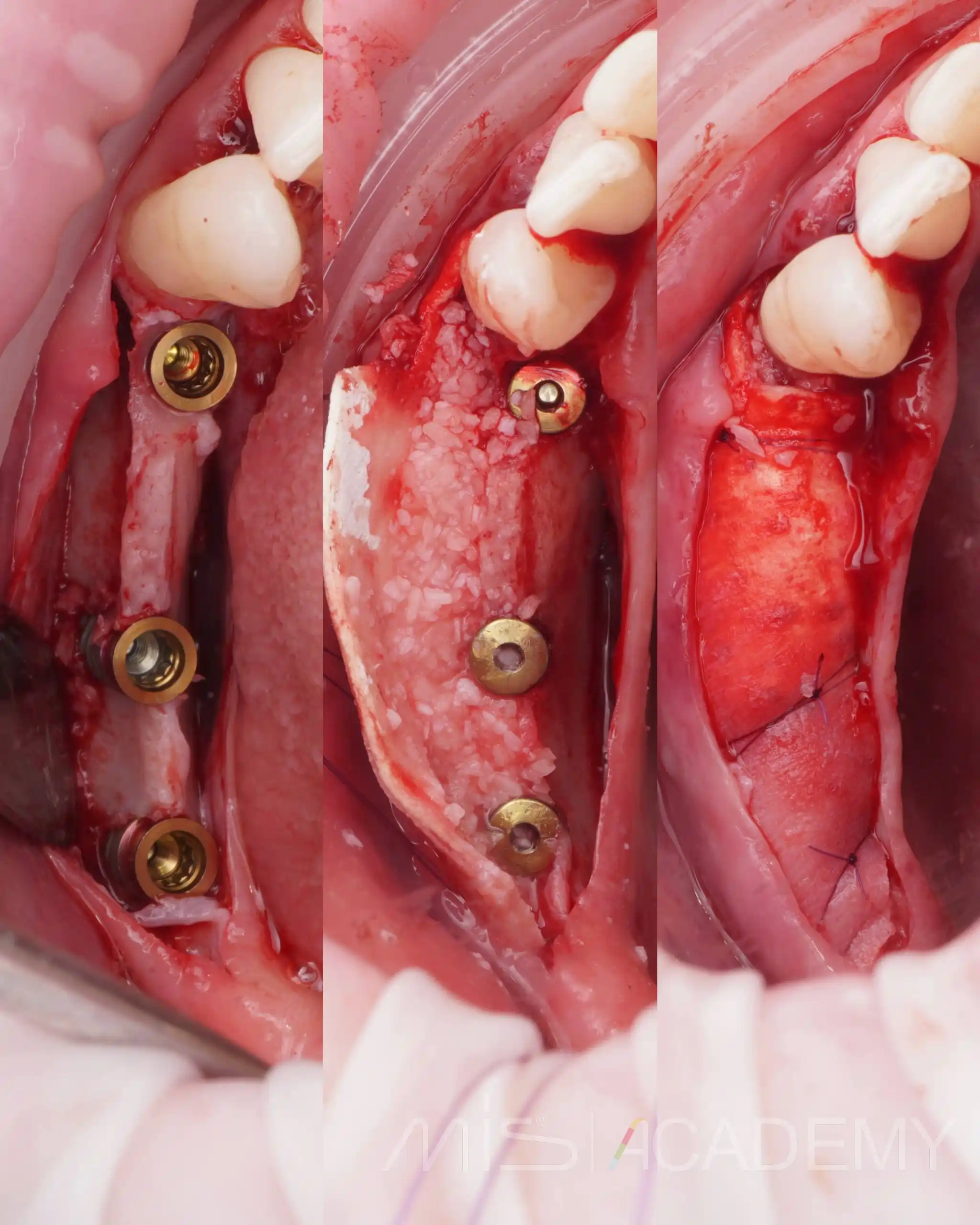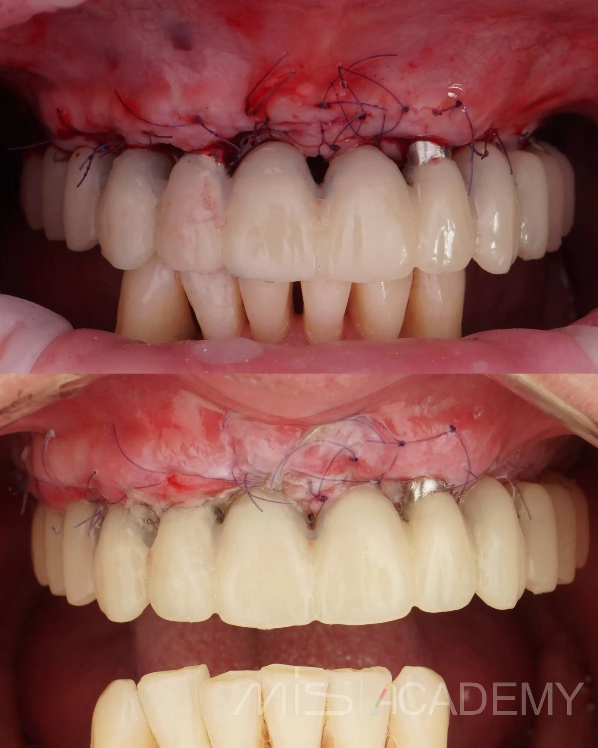 — Костная пластика материалами Osteobiol: справа ксено MP3 с Derma, слева Gen-Os с нативным коллагеном и Lamina Curved, ушивание.