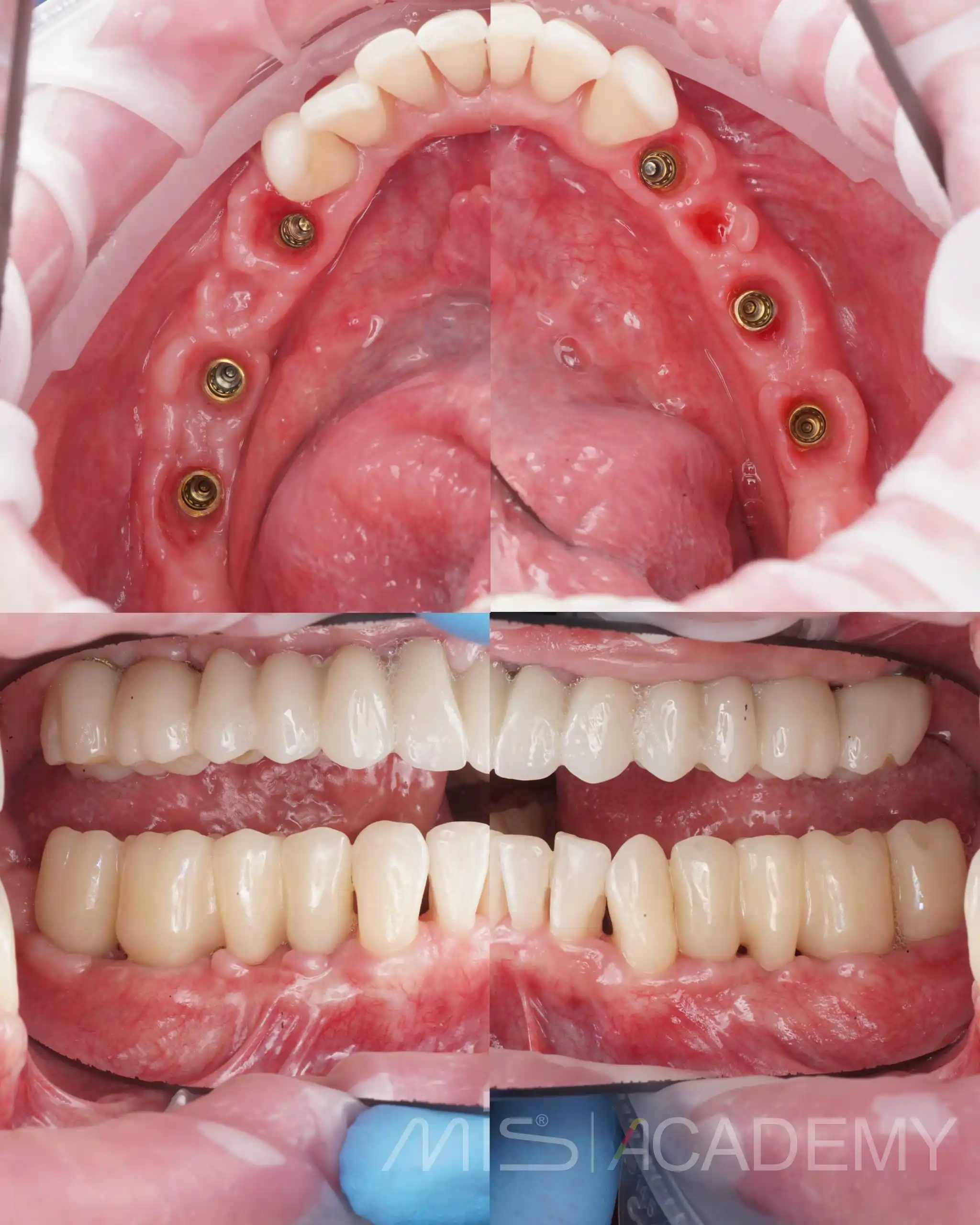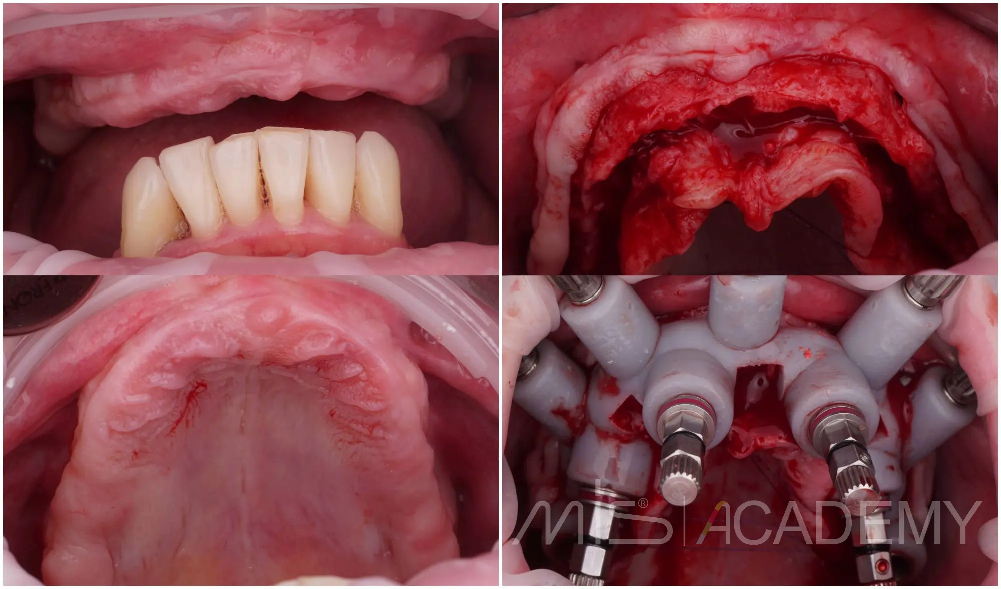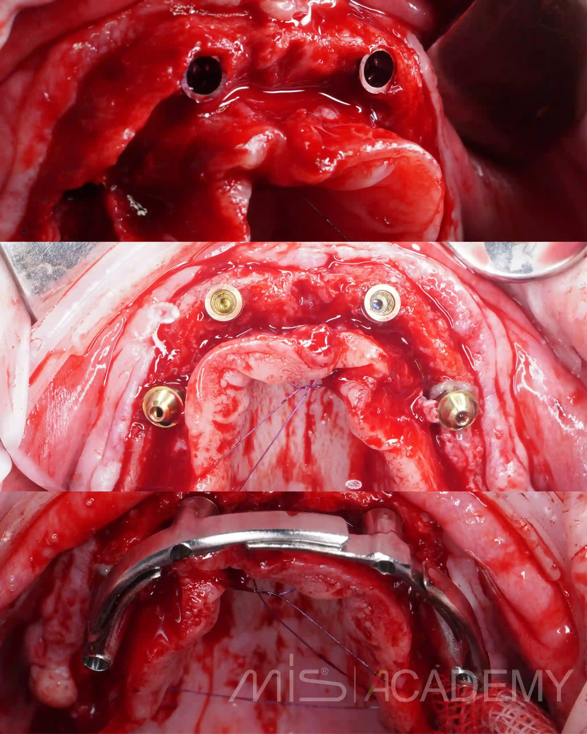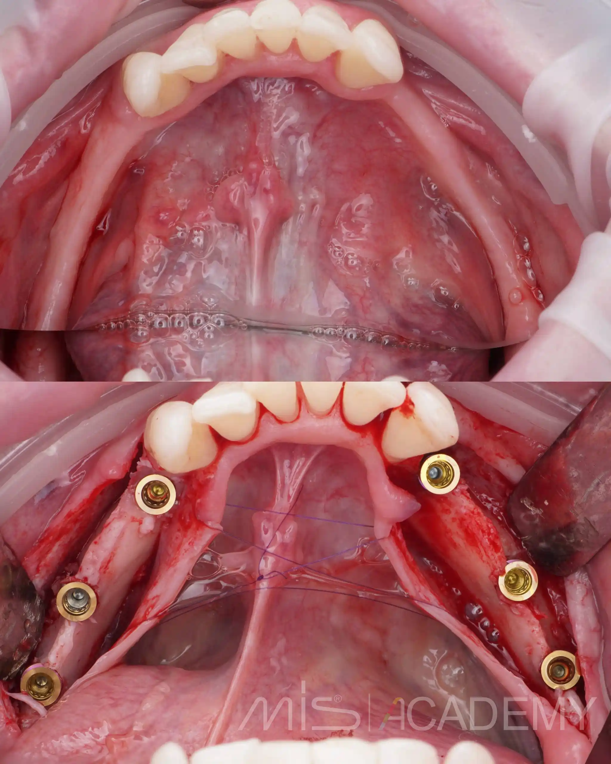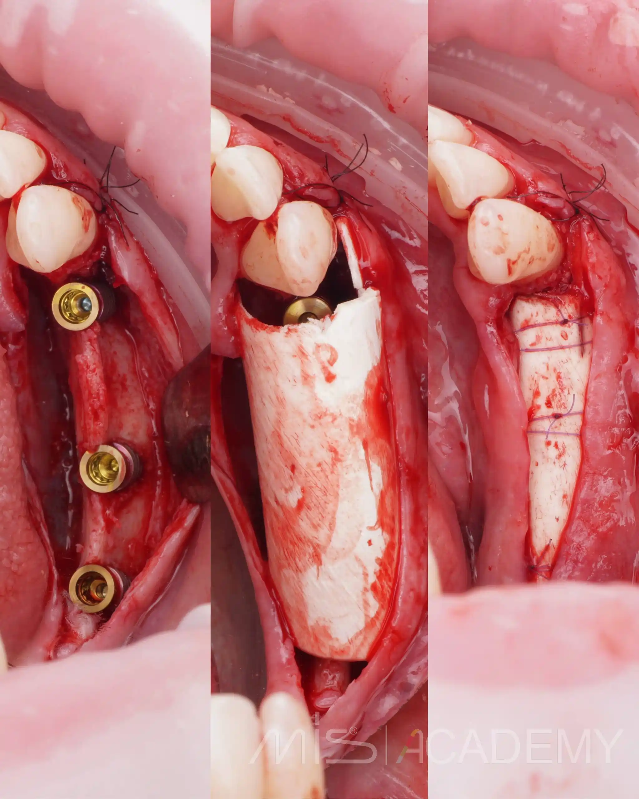 — Костная пластика материалами Osteobiol: справа ксено MP3 с Derma, слева Gen-Os с нативным коллагеном и Lamina Curved, ушивание.