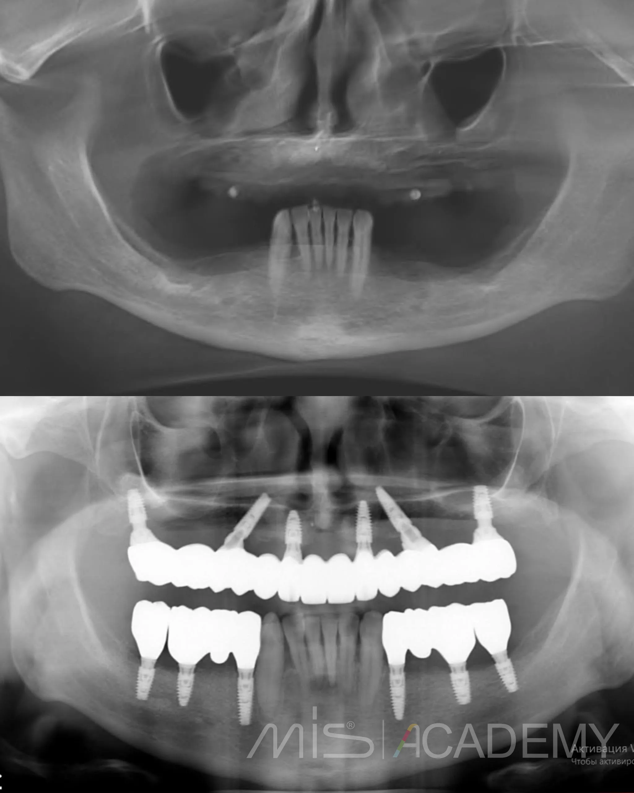 В анамнезе неудачное лечение зубов, приведшее к их удалению. В предыдущей клинике удалили все несостоятельные зубы, рекомендовали подождать 6 месяцев с временными протезами, после чего на контрольном КТ костной ткани для имплантации не увидели и на этом лечение фактически закончилось.