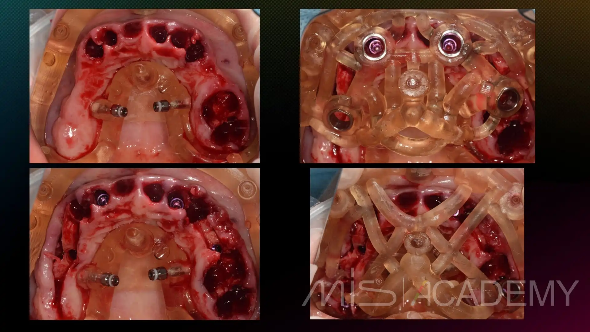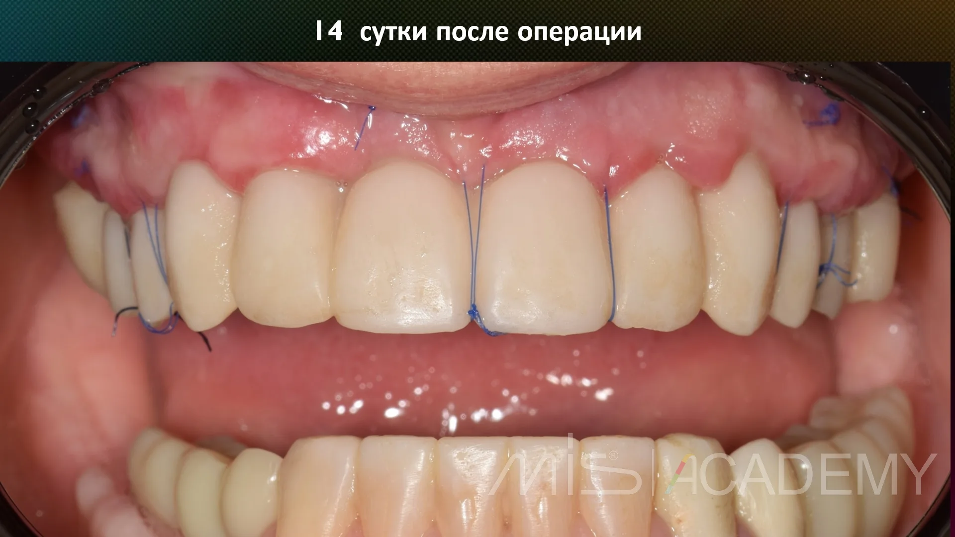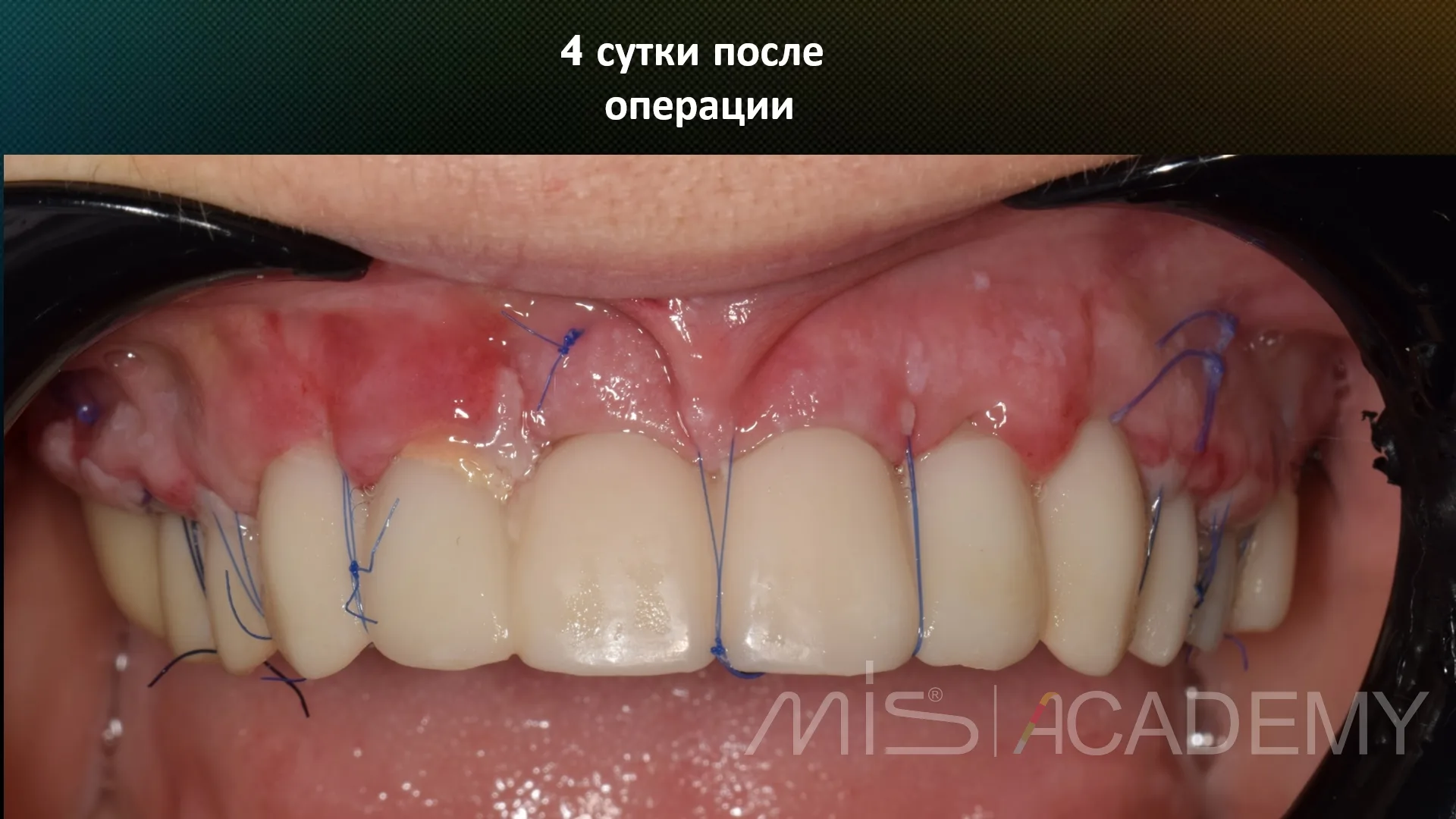 3. Удаление зубов на в/ч, установка 6 имплантатов MIS C1 по навигационному шаблону, мультиюнит абатменты, CONNECT абатменты в переднем отделе, в лунки — bio-oss, стимул-осс, пластика десны.